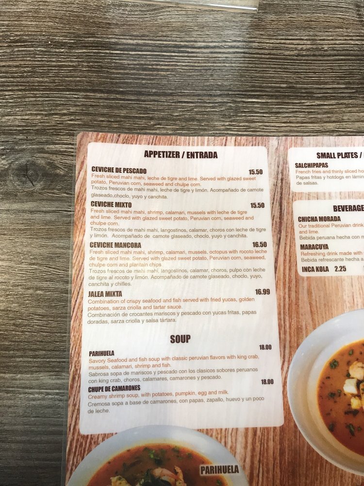 Introducing the menu at Mancora Peruvian Cuisine, a hidden gem in Alhambra, CA. This Peruvian restaurant offers a variety of delicious dishes with a focus on fresh ingredients and bold flavors. Start your meal with appetizers like the flavorful Chicharron de Pollo or the unique Causa Trio. Don't miss out on their specialty ceviches, including the Ceviche Mancora with a mix of seafood and the Leche de Tigre for a refreshing option. The diverse beverage selection includes traditional drinks like Chicha Morada and Maracuya, perfect complements to your meal. With great customer reviews raving about the friendly service and outstanding food quality, Mancora Peruvian Cuisine is a must-visit for Peruvian cuisine enthusiasts.